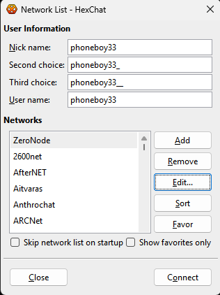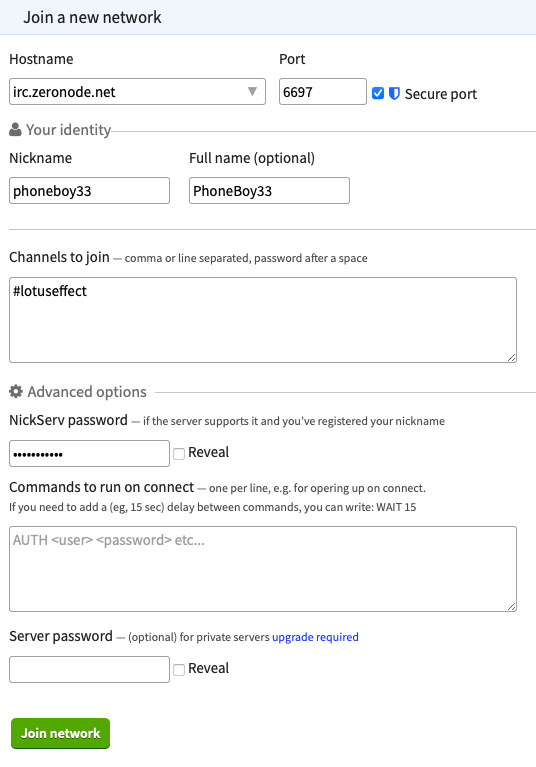 newserver/6697 should be highlighted. Click on edit, change it to irc.zeronode.net/6697 and press retun. Optionally, select "Connect to this Network Automatically" so you are connected to IRC when the application starts. Also optional: if you're registered your nick with NickServ, enter the password for your nick on the screen. Screen should look similar to the following: