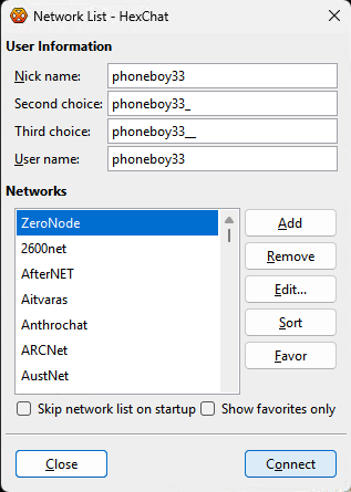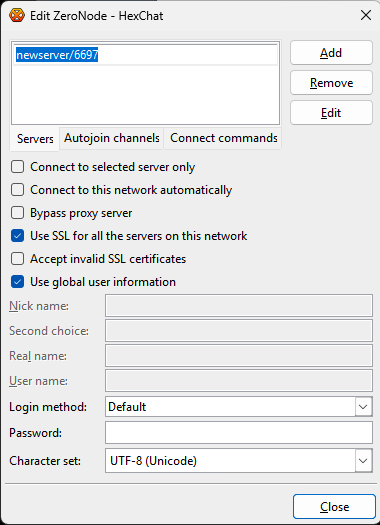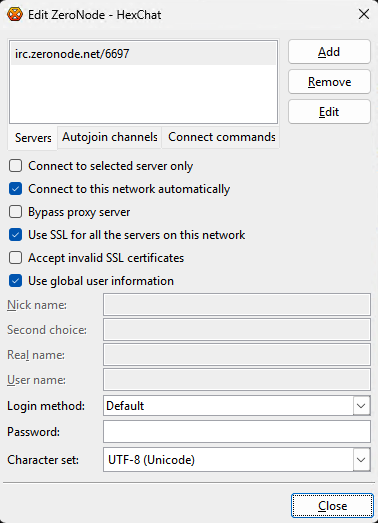 You need to configure it to connect to ZeroNode with your desired username. Change the nicknames and username as desired. Click on the Add button, type ZeroNode and press enter. You should now see: