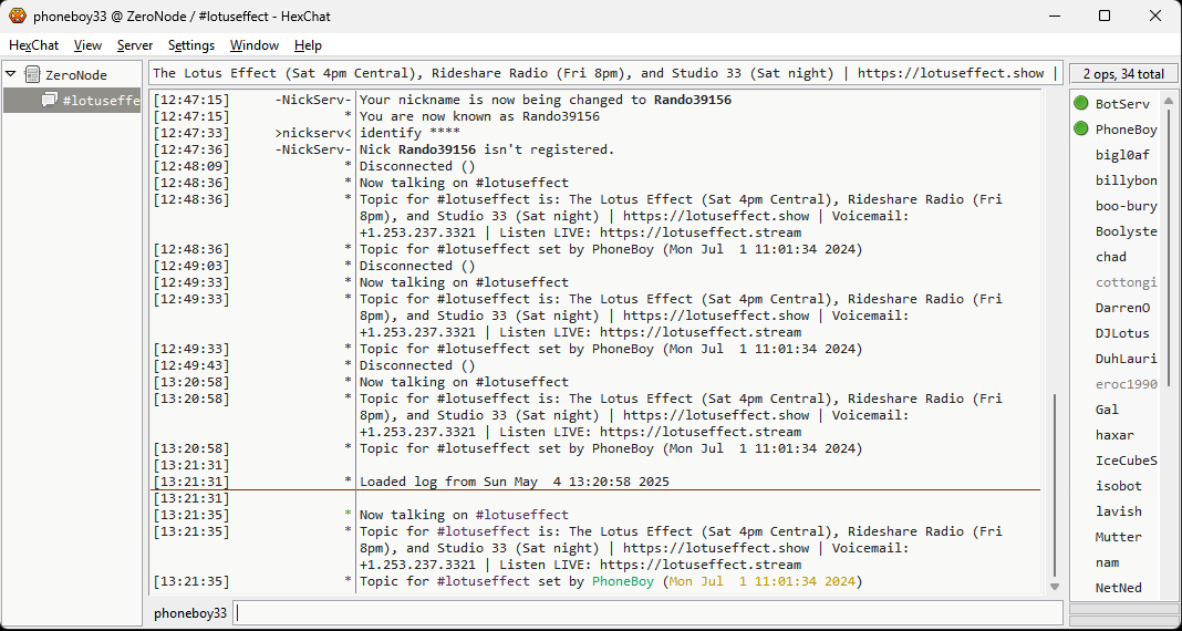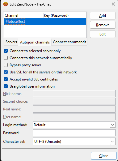 The ZeroNode IRC server has numerous channels. To ensure you are joining our chat room, add our channel. Click on Autojoin channels, click add, type #lotuseffect under channel, press return. Add other channels if desired.